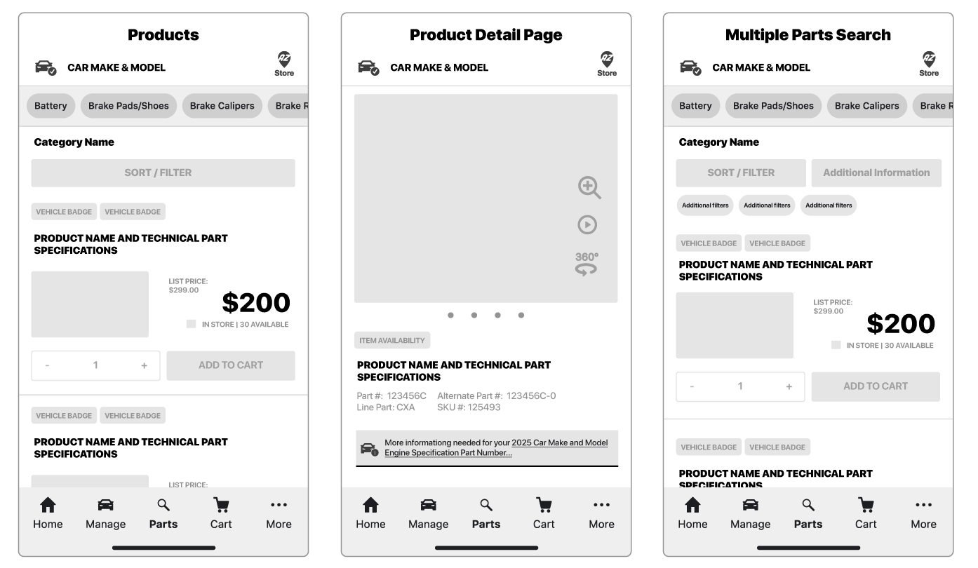 The redesign focused on search results and product detail pages — two of the most critical interaction points for AutoZone’s B2B customers.